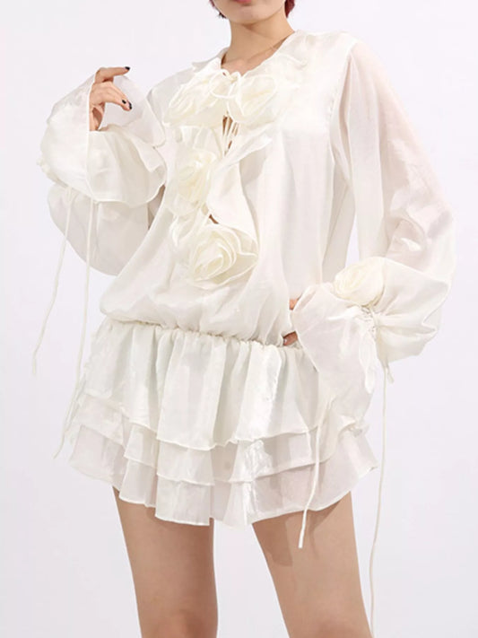 Chiffon Tie Neck Long Sleeve Mini Dress