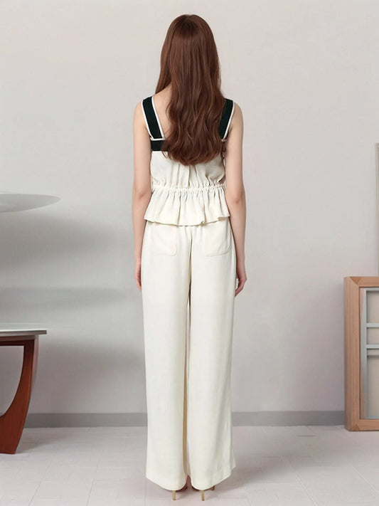Contrast Piping Round Neck Top and Wide-Leg Pants Set